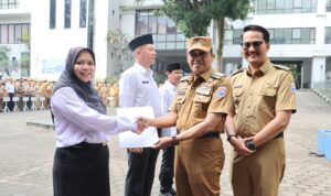 Kemudian dalam waktu yang sama juga dilakukan penyerahan device untuk program digital. Penyerahan dilakukan oleh Bupati Karawang Cellica Nurrachadiana.