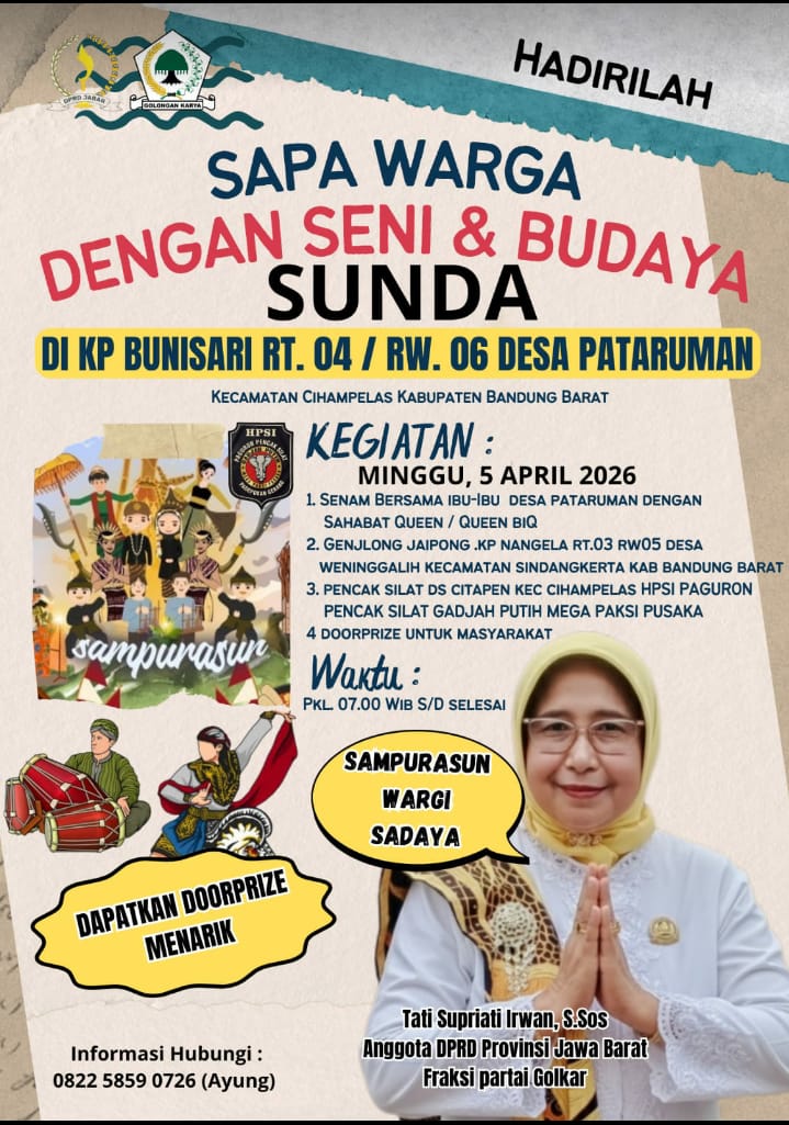 Bandung Barat.Swara Jabbar News Com.-Anggota DPRD Provinsi Jawa Barat Tati Supriati Irwan, S.Sos Fraksi Partai Golkar Dapil Jabar III (Kabupaten Bandung Barat)  akan  menggelar kegiatan Sapa Warga Dengan Seni dan Budaya Sunda diselenggarakan di Kp. Bunisari RT 04/Rw.06 Desa Pataruman  Kecamatan Cihampelas Kabupaten Bandung Barat. Minggu 5 April 2026.